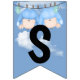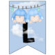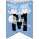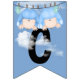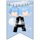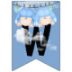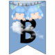 Cute twin baby boys in blue PJs hanging on a clothesline with cloud and blue sky background for twin baby baby shower.
