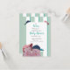 The babies watercolor painting is set upon a teal and green stripe. A pink hat and blue cap sits jauntily on the edge of the invite and on the babies' head.