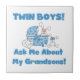 Proud new grandmas of twin baby boys will love this cute blue design featuring two bunnies in a blue bassinet and blue text that reads "Ask Me About My Grandsons!"