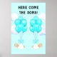 Boy twins baby shower decoration poster featuring twin baby boys beneath blue balloons.