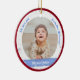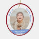 Trendy, elegant, and cute personalized First Christmas Baby Ornament for twin baby boys for grandma with a white frame with snowflakes and stars that has a round opening for a custom horizontal photo, and a curved blue band on each side on which appears the name or names of the twins in an elegant script font / typography. This design includes on the front the words "We love you, Grandma Johanna!", which you can personalize or delete. On the back there's a custom text for the year of the babies' first Christmas. With an outer Xmas red frame.