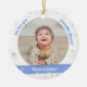 Trendy, elegant, and cute personalised First Christmas Baby Ornament for twin baby boys for grandpa with a white frame with snowflakes and stars that has a round opening for a custom horizontal photo, and a curved blue band on each side on which appears the name or names of the twins in an elegant script font / typography. This design includes on the front the words "We love you, Grandpa Jason!", which you can personalise or delete. On the back there's a custom text for the year of the babies' first Christmas.