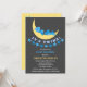 © Socialite Designs. Cute blue teddy bears sleeping on the moon twin baby shower invitation. The design also has a star banner and "It's Twins!" text. The back of the invitation has a yellow background with assorted sized stars. All design elements can be moved, resized or deleted to suit your event.