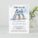 Elegant simple winter fall animal twin boys baby shower invitation featuring watercolor illustration of two cute little baby penguins with blue scarves and beanies. Twin boys!