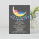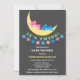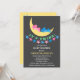© 2013 Socialite Designs. Cute pink and blue teddy bears sleeping on the moon twin baby shower invitation. The design also has a star banner and "It's Twins!" text. The back of the invitation has a yellow background with assorted sized pink and blue stars. All design elements can be moved, resized or deleted to suit your event.