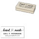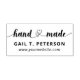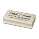 Rubber stamp for your small business selling handmade goods with handmade written in a calligraphy script where entwined hearts separate the words to indicate it's handmade with love. Add your name or business name and website.