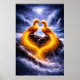 Two golden phoenixes face each other at the edge of the world, their radiant feathers flowing into a single heart-shaped glow.