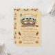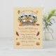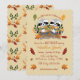 A cute fall baby shower invitation for twins . It features two adorable raccoons sitting on autumn leaves and holding a milk bottle on the front and a fall foliage pattern on the back . Personalise it with your own text using the provided template .