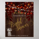 Chic and classy bridal shower sign poster with rustic twinkle lights, mason jar with white flowers and rust autumn leaves and "bridal shower" gold calligraphy script on brown barn wood background. Ideal for your night autumn fall | country rustic themed bridal showers.