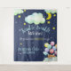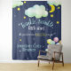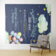 This cute navy and gender neutral baby shower tapestry or photo booth backdrop features the phrase, "Twinkle twinkle, little star, do you know how EXCITED we are?" in trendy hand lettered script with gold stars, pink clouds, a moon, and a fox woodland animal with balloons. This is perfect for the couples baby shower for a baby girl or boy, and is easy to customise with your baby's name..