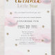 This cute twinkle twinkle little star" baby shower invitation features a white background with faux gold glitter stars and fluffy pink clouds. It includes a book request/books for baby/please bring a book card. Personalise for your needs. You can find more matching products at my store.