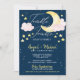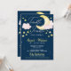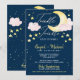 Theme Parties Twinkle Twinkle Little Star baby shower invitation design features watercolor elements including a cute watercolor moon floating on pretty pink watercolor clouds and surrounded by yellow watercolor stars. Our baby shower invitation design is accented with tiny little stars and hand-lettered brush typography and set on navy blue background. Script accent typography is paired with modern block lettering. #BabyShower #ItsAGirl #Invitations