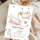 This pink and gold twinkle twinkle little star, swan, and flowers. These baby shower invitations are easily customised for your event by simply adding your details.