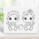 Cute cartoon babies, boy and girl, in jumpsuits with matching star bibs holding baby rattles. Toy ball is resting between them. Made for easy colouring.