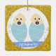 Trendy, elegant, and cute personalised First Christmas Twins Baby Boys Ornament for grandparents with a white frame with snowflakes and stars on a (faux) golden glitter background. The front has a round opening for a custom twin baby boys and grandparents photo and two blue bands, on which appear the names of the newborns in an modern script font / typography, and the other custom text, "Our First Christmas as Grandparents" The back has an image of twin babies, which you can keep or replace with a photo, and the customisable text "First Christmas 202Y" on a blue band.