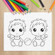 Cute cartoon baby boys in jumpsuits with matching star bibs holding baby rattles. Toy ball is resting between them.