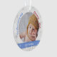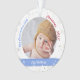 Trendy, elegant, and cute personalised First Christmas Baby Ornament for boy and girl twins with white frame with snowflakes and stars that has a round opening for a custom horizontal photo, and curved band on each side (blue and pink) on which appears the name or names of the twins in an elegant script font / typography. This design includes on the front the words "Our first merry little Christmas 202X"