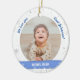 Trendy, elegant, and cute personalised First Christmas Baby Ornament for twin baby boys for a favourite aunt with a white frame with snowflakes and stars that has a round opening for a custom horizontal photo, and a curved blue band on each side on which appears the name or names of the twins in an elegant script font / typography. This design includes on the front the words "We love you, Aunt Johanna!", which you can personalise or delete. On the back there's a custom text for the year of the babies' first Christmas.