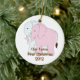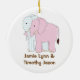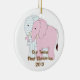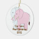 Sweet Christmas ornament, with adorable graphics of a blue striped and a pink polka dot elephant holding trunks. Brown text below reads, Our Twins First Christmas, with the year. On the back are the same colourful elephants with the names in brown text. Personalise all the text for your children's first Christmas.