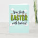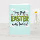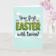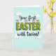 Designed with a sweet spring theme, this digital illustration features the message “Your first EASTER with twins!” centered prominently on a soft sky-blue background 🌷. The word “EASTER” sits in the middle in rounded, plump green letters with gentle shading that makes it look softly raised. Above the green letters, four small sheep-like characters with fluffy white bodies and simple brown faces perch in a row, their calm eyes and close spacing suggesting a tender, together feeling 🐇. The surrounding space is airy and light, with a faint gradient in the blue that feels like an early morning sky. Small white specks are scattered across the background like tiny sparkles, adding a quiet sense of celebration. The rest of the text, “Your first” and “with twins!”, appears in a flowing, cursive-style font placed above and below the main word in a darker contrasting color for easy reading. Puffy white clouds float near the edges of the design, framing the scene with soft, rounded shapes.