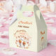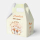 Two little pumpkins are on the way, cute Fall Halloween Twins Gender Neutral Unisex Baby Shower Small Gable Favour Boxes featuring an adorable ghost holding two cute pumpkins on the fall-themed background with autumn leaves all in the light green, orange and brown shades. You can choose from 3 sizes of these gable favour boxes. Easily personalise the text. - Kate Eden Art