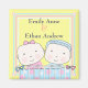 A sweet design featuring a baby girl and boy in their little crib decorated with a pink and blue bumper. A very cute image for welcoming twin babies! Makes a great gift for the new parents.
