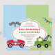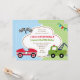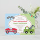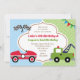 Cute split invitation for twins / siblings / single child, in dual / duo theme: race car & tow truck in blue & green