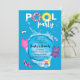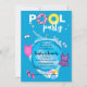 Celebrate a birthday for twins with a splash! This invitation features pool items (goggles, swimsuit, flip flops, ball, swimsuits, and floats) that surround a splash of water. Inside the splash of water are the details of the invite.