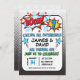 This boy's twins superhero 1st birthday invitation features a large number, cartoon like words and elements on a white and black background. I wanted to create some new boy's superhero invitations especially for a 1st birthday because I don't have any at the store at the moment. Similar version of this design with a photograph is also available at the store. This boy's twins 1st birthday superhero invitation is ready to be personalised.