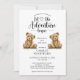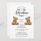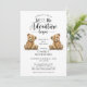 Let the adventure begin whimsical twins baby shower invitation, featuring gender neutral baby teddy bears illustration. Calligraphy script typography.