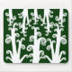 A mouse pad with an interesting decorative drawing of unusual twirly looking plants.