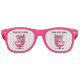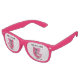 These retro party glasses have to atomic style cats, one black and one white sitting together in a chair done in shades of bright pink on a white background with pink dots. Customise your text with the template.