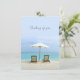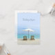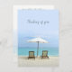 Two beach chairs "thinking of you" custom flat blank note cards. Sitting in paradise beside turquoise sea water, this image brings to mind a special person. Send a modern flat card to let them know they are thought of. Smaller size cards offer paper upgrades and have custom text on both sides. On the back include a name or other text across the top. The same beach chairs and umbrella image is the transparent background for your personal hand-written message. Comes with white envelopes.