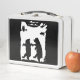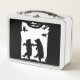 This metal lunch box has a black on white silhouette image of two bears dancing together under trees in the woods with an owl watching from a branch above them on the front and back.