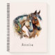 Spiral notebook with an image featuring a pair of horses. Wearing decorative headbands. Surrounded by feathers and foliage.
