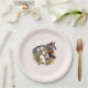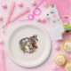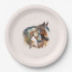 Paper plates with an image featuring a pair of horses. Wearing decorative headbands. Surrounded by feathers and foliage.