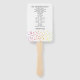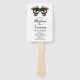 Two skull brides and confetti in rainbow colours Halloween lesbian hand fan wedding program. This wedding design features the skulls of two brides with bows in rainbow colours. The back includes a band of a pattern of colourful confetti.
