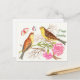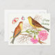 18th century illustration of two brown and yellow birds on branches with carnations and butterflies