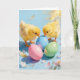 Two adorable, fluffy, yellow chicks examine pastel-coloured Easter eggs on this very cute Easter card. Great for kids, as well as adults.
