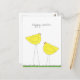 This postcard is printed with a hand-drawn Easter design featuring two long-legged chicks standing in grass. The message "happy easter" is typed above.