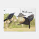 A Doormat with a photograph of two Grackle birds or Crows flying around a bird feeder. The word Welcome can be deleted or changed to different word. This photograph is copyrighted by me, the Photographer.