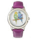 The watch looks exactly as depicted. I was especially pleased with the watch band, which is a nice quality, supple leather. I point this out because an option, which was sold out, was with a multi-colored but clearly plastic band. This is the better choice, in my view.