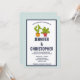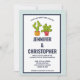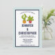 A fun casual wedding invitation with a whimsical illustration featuring 2 happy little cacti sitting in their own flower pots. They each have their own unique expressions looking happy and joyful. The background is a pattern of mint green polka dots.
