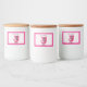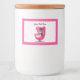 This custom label for a food jar or box has two cute cats in black and white wearing diamond collars sitting in a mid century pink chair on a white background with pink polka dots and border. Customise your text with the template.