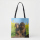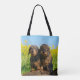 Two adorable wild boar coloured wire haired dachshund dogs side by side in front of yellow flowering rape blossoms. A cute funny doggy photo taken by Katho Menden. This all-over printing shopping tote bag is a gift idea for dog lovers. http://www.zazzle.com/kathom_photo