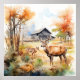Two deer in mountain landscape with trees and flowers