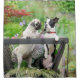 Two cute dogs, a black masked fawn pug puppy and a young Boston Terrier, black with white markings, posing side by side and talking together in an old wooden cart in a garden. A cute doggy photo taken by Katho Menden, this shower curtain is an enchanting gift idea for dog and pet lovers.