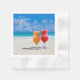 Two drinks paper napkins with text template at the top. Frosty cocktails sit on a sunny beach with tropical ocean water in the background. White text across the top can say anything, or delete it to order the napkins blank. Many sizes and options.