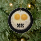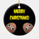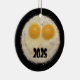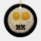 Photograph of two fried eggs in a cast iron pan with the year printed below. On the reverse side the text, "Merry Christmas" is printed above and below, two brown whole eggs with googly eyes "peeking in" from the bottom. The ornament would be a happy, funny and unique ornament for a diner owner or cook, an egg farmer, or a mom or dad who loves to fry eggs that look like faces. Egg images copyright 2012 by Margaret E. Cmelik.