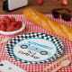 A cute retro style blue race car with customised text. The outer circle is a racing pattern. The number in the middle of the car can be customised, as well as all of the wording.